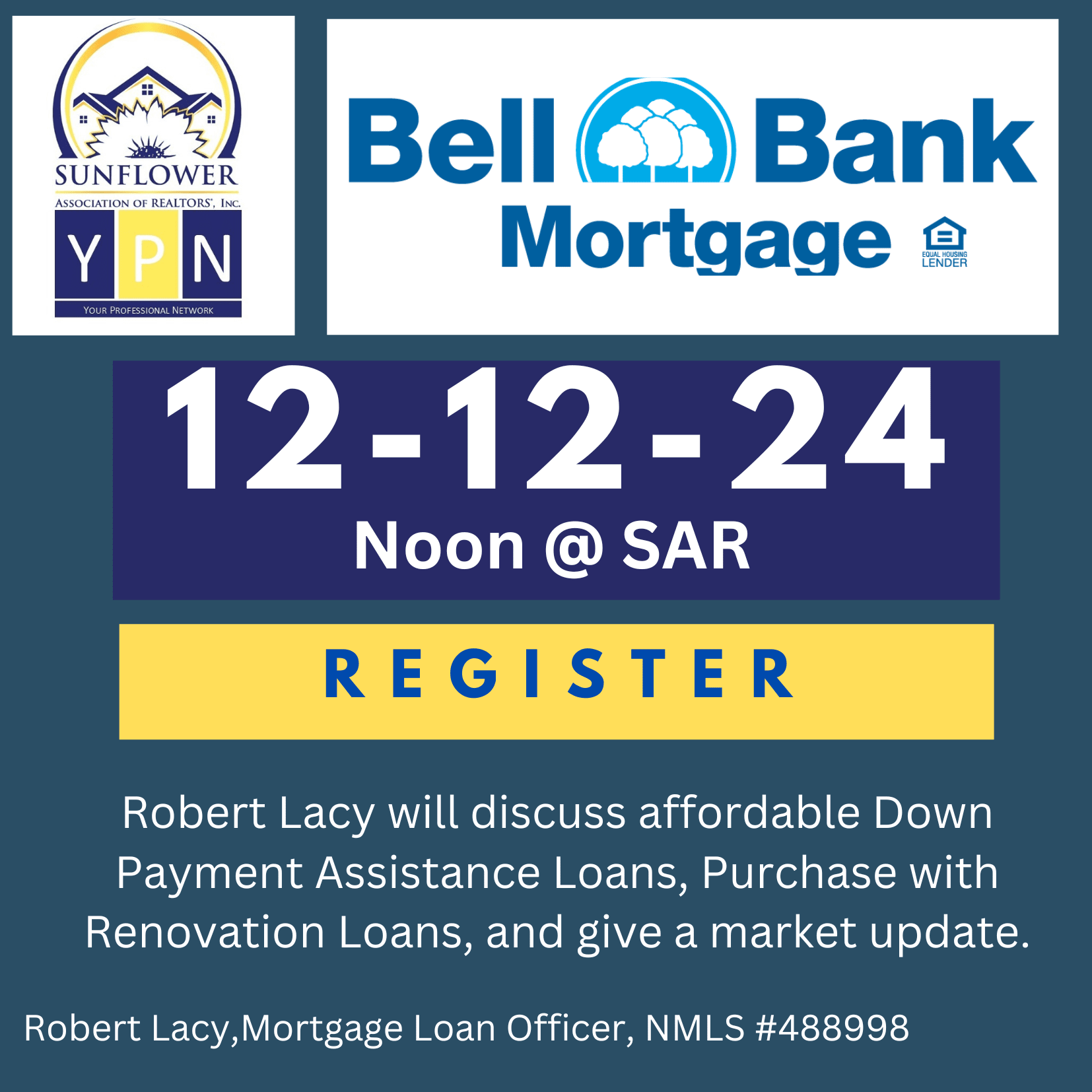 Robert Lacy, Bell Bank Mortgage, will discuss down payment assistance loans, purchase with renovation loans, the current market, and answer questions.